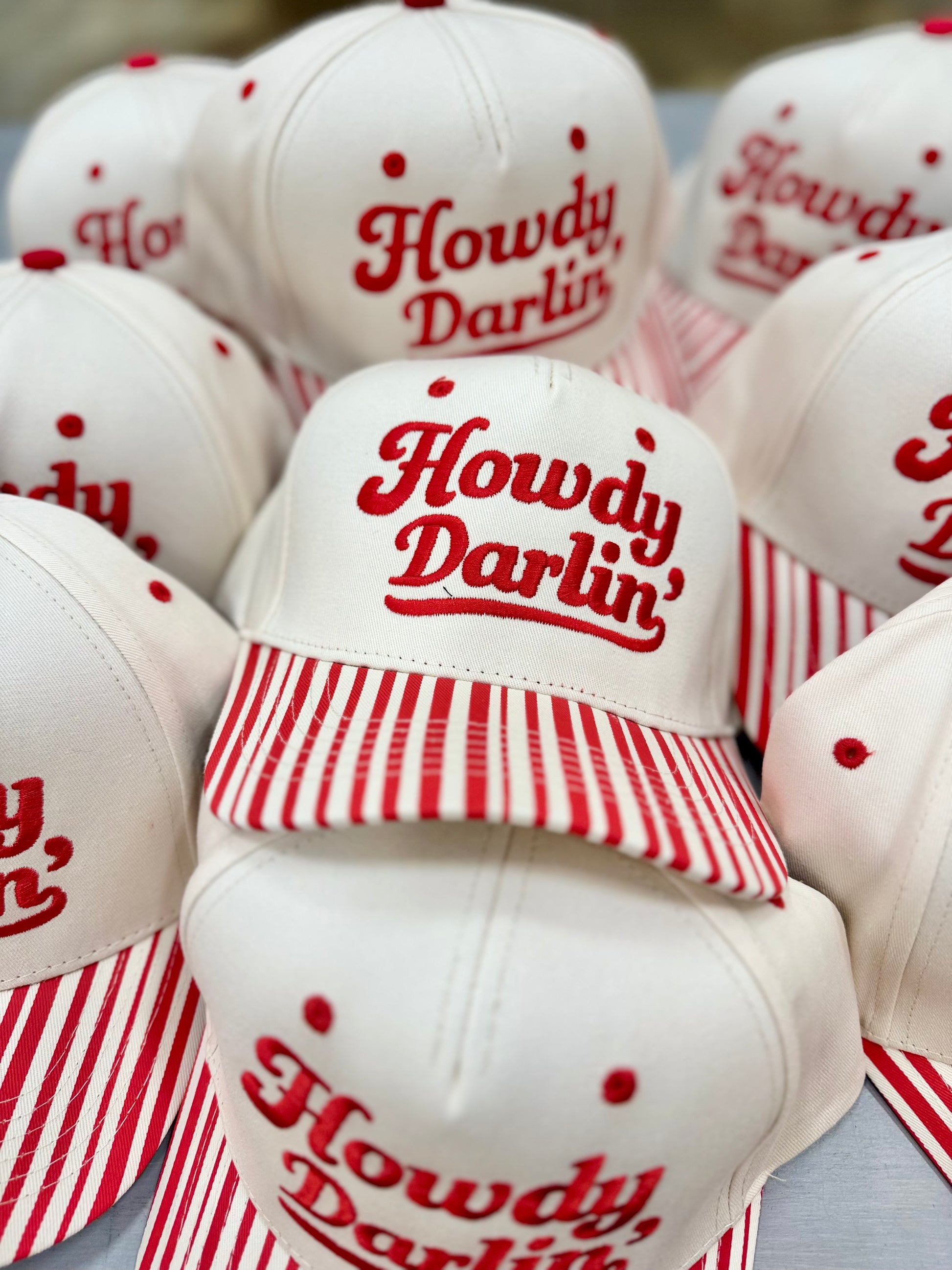 A little sweet, a little Southern, and effortlessly charming. The Howdy Darlin’ Trucker Hat blends classic romance with a modern western edge. Crafted with bold red embroidery on a soft neutral canvas crown and finished with a playful striped brim, this piece is designed to turn heads and spark smiles.